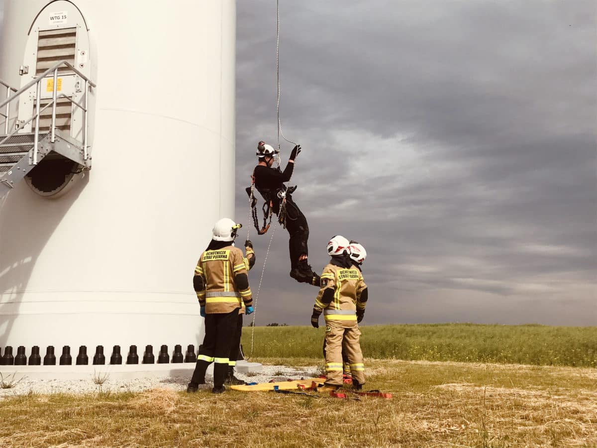 Dobrostan pracowników jest dla nas kwestią kluczową, dlatego cyklicznie organizujemy szkolenia z bezpieczeństwa i ewakuacji z turbin wiatrowych. W kursach biorą udział technicy, którzy na co dzień pracują w parkach wiatrowych. Na szkolenia zapraszamy także strażaków z okolicznych OSP i najbliższych jednostek Państwowej Straży Pożarnej, którzy jako pierwsi mogą pojawić się na miejscu ewentualnego wypadku.